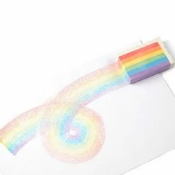 - Add water to chalk dust sprinkle stamper to make chalk paint, trace shapes on 3 extra-thick stencil sheets, and make rainbows with the multi-colored slice of cake