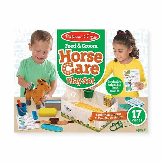 Your little equestrian will adore horsing around with this Melissa & Doug Feed & Groom Horse Care Play Set.