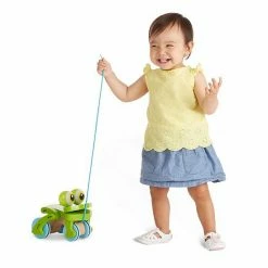 - Frolicking frog bounces and bobs as kids pull wheeled toy with string