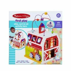 This barn-shaped activity cube has it all-beads to spin and slide along two coated wire mazes, six removable play pieces to match and sort, flaps to open and close, and even hay bales to drop and roll down the chute! Open numbered windows to discover surprises inside, push the tractor with gear wheels along the track, open and close the barn doors, flip pieces to match three animals in a row, and so much more! Sturdy wooden construction, paired with whimsical farm-themed designs, make this a long-lasting and welcome addition to any playroom. First Play toys feature bright colors, bold patterns and whimsical designs that boost skills while sparking imagination and wonder-right from the start!