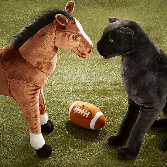 Pretend to be a cowgirl or a farmer with this Melissa & Doug giant stuffed animal featuring a realistic blaze on its forehead and stockings on the feet.