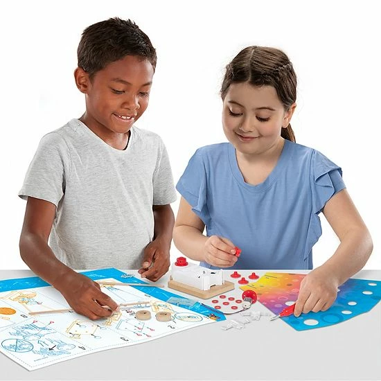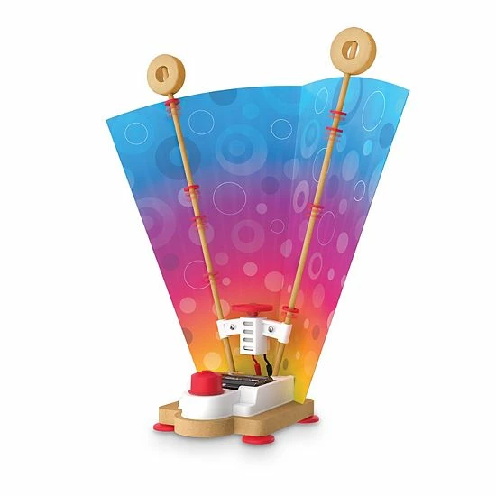 Engineer a working machine with vibrating motor that sends rings moving up and down two poles, while exploring the principles of sound and vibrations with the Melissa & Doug Innovation Academy Moving Rings.