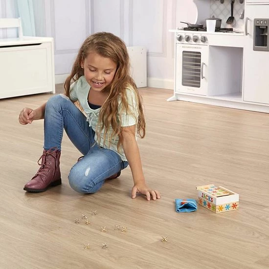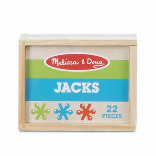 The traditional game of jacks has gotten a fresh makeover from Melissa & Doug! Scatter the jacks, bounce a ball, and try to collect the correct number of jacks and the ball in one hand before the ball bounces twice.