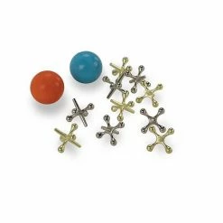 - Includes 5 gold-colored and 5 silver-colored metal jacks, 2 bouncy balls, storage pouch, wooden storage box with lid, detailed game instructions, and challenging variations