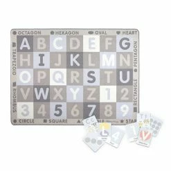 - Oversized activity rug in neutral colors (grays and light blues) with illustrated alphabet, numbers 1-9, and shapes