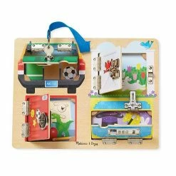 Kids will delight in discovering what’s hiding behind the locked and latched panels on this wooden play board from Melissa & Doug.