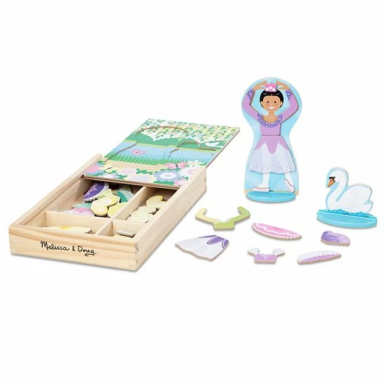 - Includes double-sided wooden magnetic ballerina/fairy, wooden magnetic swan, 2 durable stands, 52 wooden magnetic clothing and accessory pieces