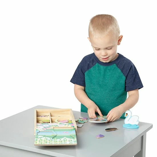 Combine dozens of magnetic wooden pieces in coordinating designs to dress a beautiful double-sided figure with a ballerina on one side and a fairy on the other, as well as their beautiful swan companion!