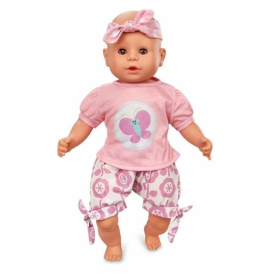 - Includes puff-sleeved T-shirt, dress with scalloped sleeves, soft polka-dot leggings, flower-patterned tie-up shorts, cardigan with top bow, and a polka-dot adjustable headband (Dolls/stuffed animals not included with this set.)