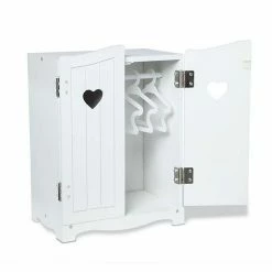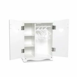 Help favorite dolls and stuffed animals get organized with this realistic and modernly styled wooden armoire that suits any décor! There are three shelves for folded doll clothes and a rod with three hangers for dresses and jackets (clothing not included).
