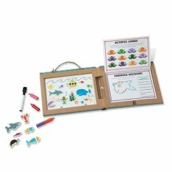 Make waves! The Natural Play ocean-themed Play, Draw, Create activity kit offers hours of imaginative, creative play anytime, anywhere! This reusable drawing and magnet activity kit includes a take-along case with rope handles to conveniently store and carry 42 magnets, 5 dry-erase markers with an eraser, a built-in magnetic dry erase board, and a 13-page spiral-bound dry-erase activity book.