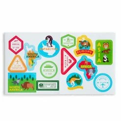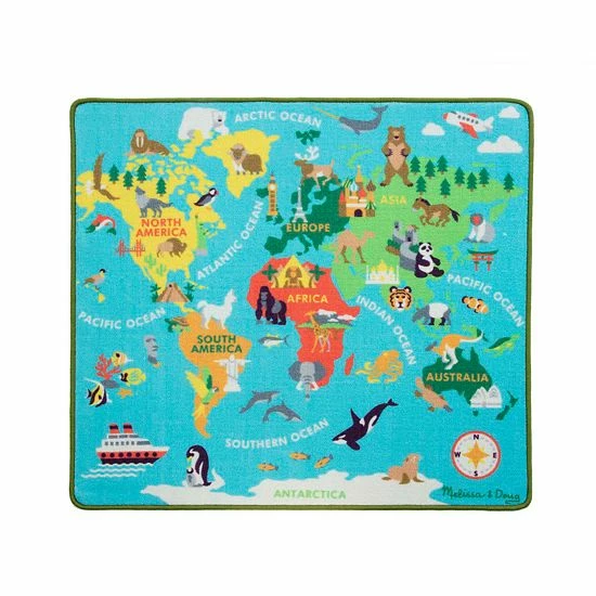 - Get ready for exciting globe-trotting adventures with this sturdy, colorful world map play rug! Durably made to look great for countless playtimes to come, the woven rug with reinforced border binding and skid-proof backing comes with three wooden vehicles (car, airplane, and boat) for traveling across the world, as well as a passport with stickers to keep track of places visited! The illustrated map features labeled continents and oceans, native animals, points of interest, a compass rose, and more to give lots of options for creative play. Large format is big enough for multiple kids and lots of play pieces.