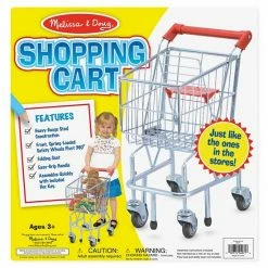 Shop ’til you drop with this Melissa & Doug shopping cart featuring a realistic metal design and a folding doll seat. In silver.