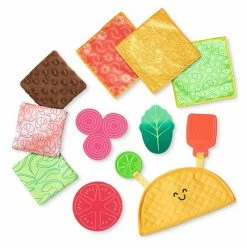 - The 12-piece infant toy includes a soft foam taco shell, 3 smooth fabric pieces, 3 textured crinkle pieces, 3 food-shaped fabric pieces, 2 attached textured pieces