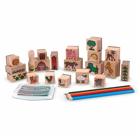 - Includes: 20 stamps, 5 colored pencils, stamp pad, & wooden storage tray