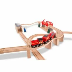 - 47-piece set includes: swivel bridge, 3 train cars, tunnel, 34 track pieces & accessories